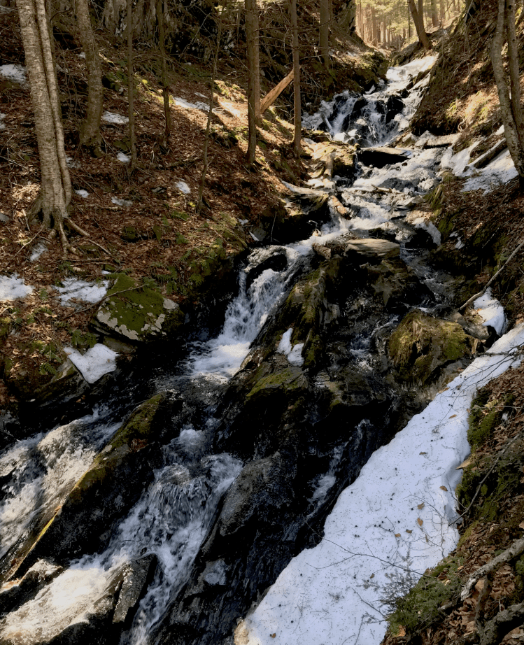 Route: Cross Beaver Meadow Rd to the Brown Schoolhouse trailhead. Carefully cross Charles Brown Brook, then head uphill to the junction with the Bill Ballard Tr. Turn right and walk about 45 minutes to where the trail crosses a brook on stones. Turn left, ascending a small rib with the “canyon” on the left, filled with its cascades of ice in winter. Return by the same route.