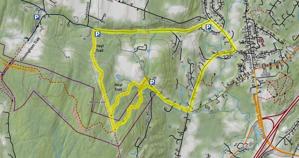 The Heyl Trail can be walked as as part of a 3.5-mile loop with 670 feet of uphill, starting at the pizza oven parking lot at the bottom of Bragg Hill Road. This route involves walking on town roads. Walk up Bragg Hill , turning left at the power line on the Heyl Trail until it descends from the left at a blue “Heyl Trail” sign, reaching the top of Elm Street. Continue to turn left on Hopson Road, left on Beaver Meadow Road, until you have returned to parking.