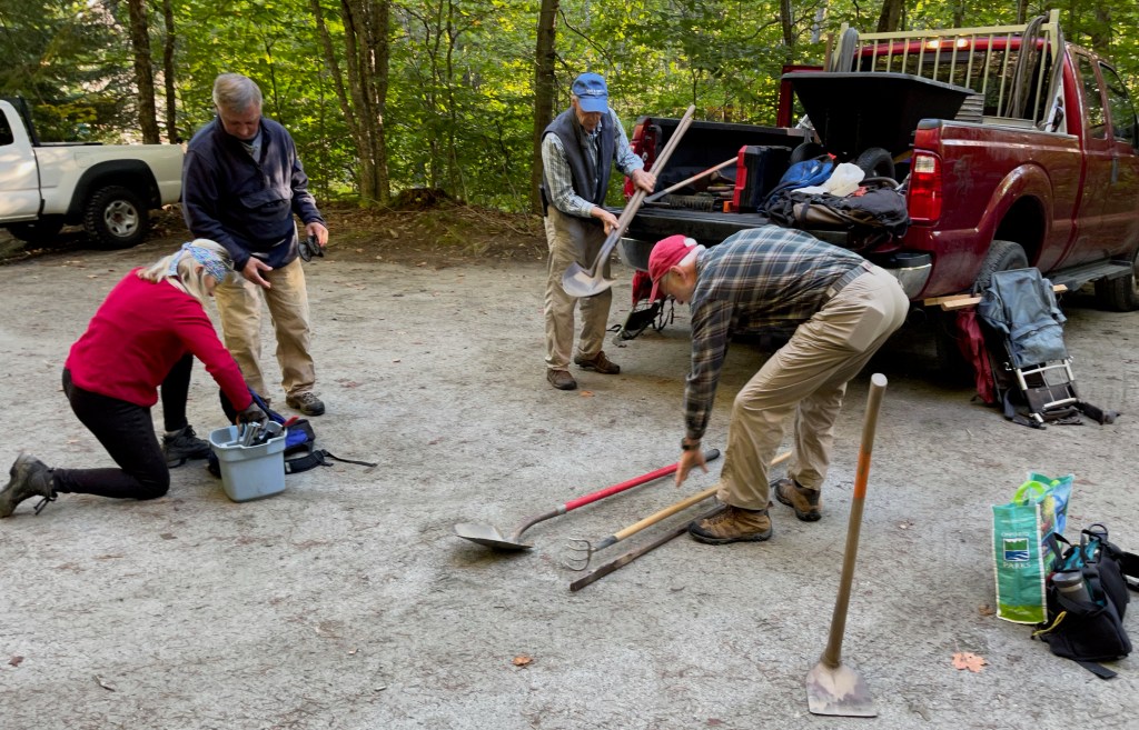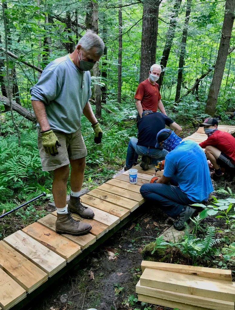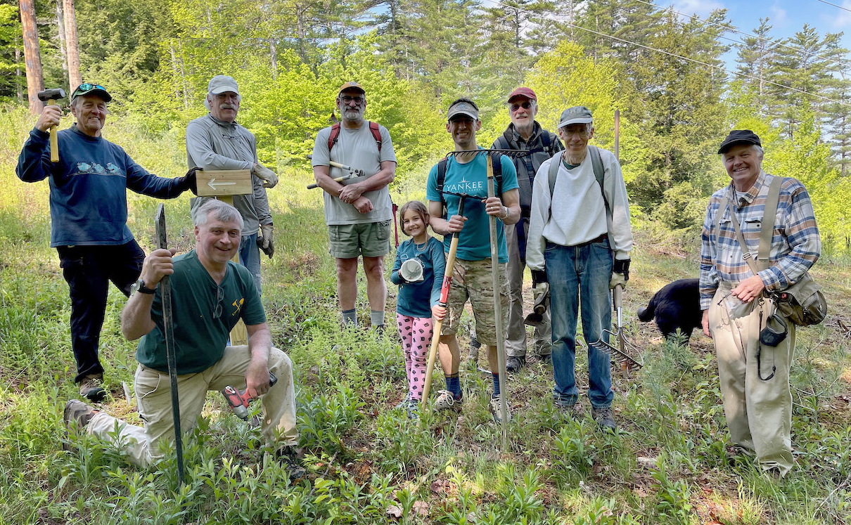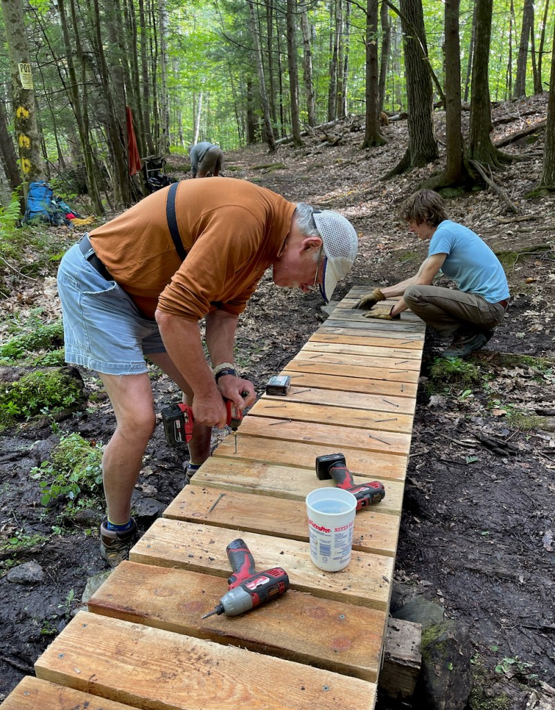 Norwich has a lot of running and standing water along its many trails, especially the Ballard Trail. Consequently, Norwich trails have bridges spanning streams and bog bridges, supported on piers, spanning marshy areas. These were all portered to the site and assembled by volunteers. Behind all this effort stands Jim Faughnan, who planned the execution of many of these projects, measuring the gaps to be spanned, calculating the lumber to be purchased, ordering it and pre-cutting it, ready for portering and assembly. In addition to his home shop, Jim has an impressive array of tools for use in the field that contribute to the rapid demolition of decayed structures and the rapid construction of new ones. On site, he provides instructive guidance to volunteers, as they go about accomplishing the work. Jim’s efforts, off site and on, contribute to everyone’s sense of accomplishment when the job is done.