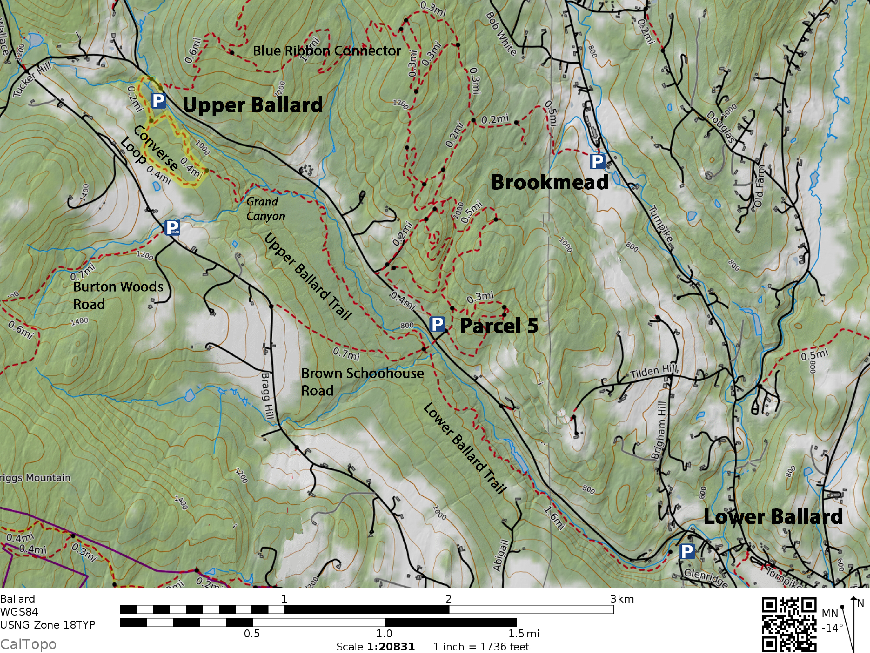 From Ballard Park to the Brown Schoolhouse Road crossing is called Lower Ballard Trail. From there to the top is called Upper Ballard Trail.