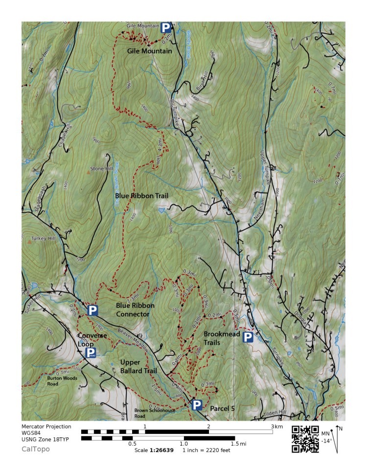 The first map has been updated to show several trails constructed in 2020-21. Near the top of the main trail, a new connector drops down to the Brookmead trail system, primarily for skiers and grooming equipment to flow between the two systems. Two new trails intended mainly for mountain biking are shown with blue dots: Just W of the trailhead, a new flow trail P5 Fo Fun, allows most riders to climb gently up to the top of the parcel. Just before it joins the top of the main trail, Dole It Out branches S, providing a more challenging descent that rejoins the main trail lower down.