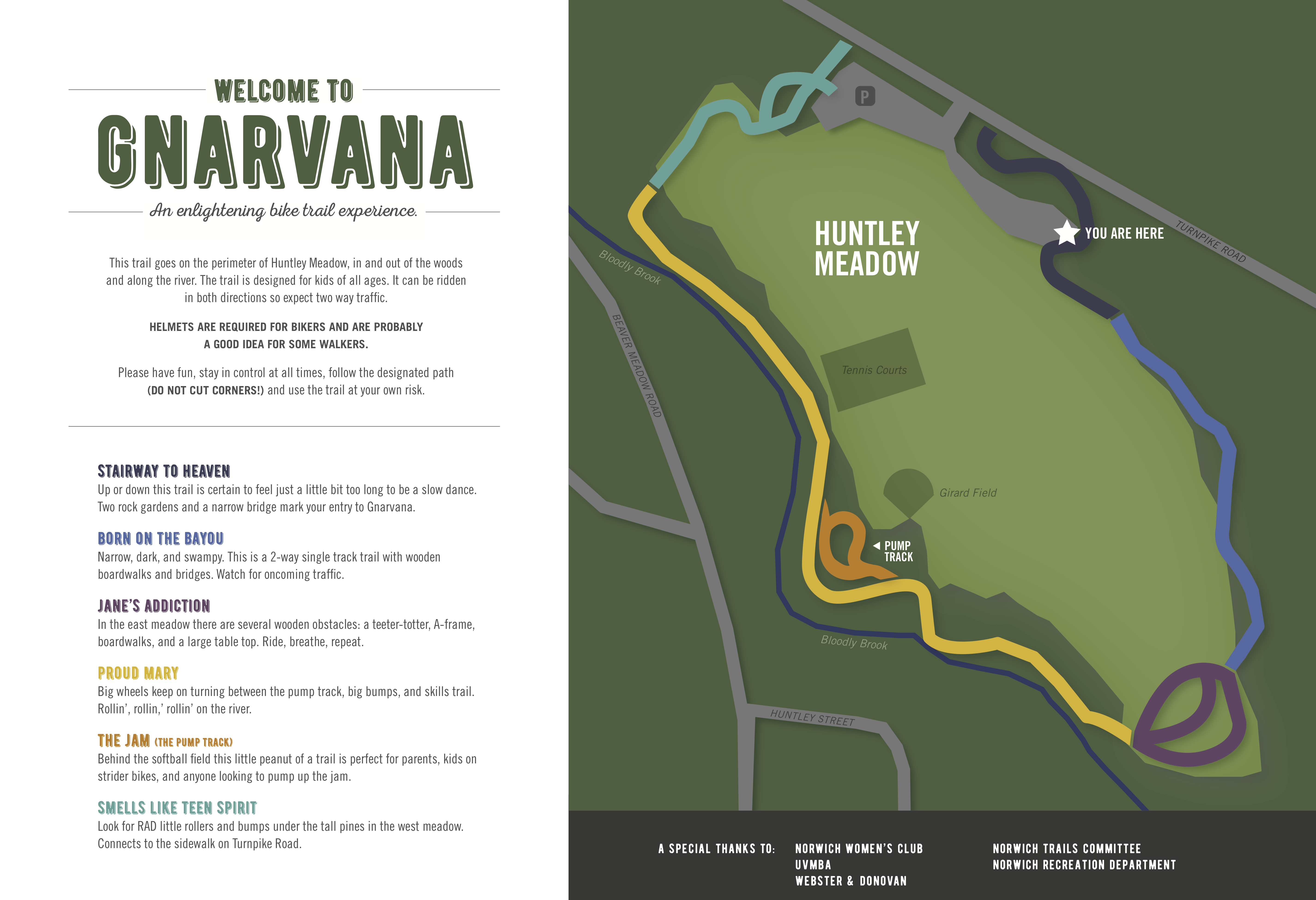 Easy mountain biking for all ages on a loop trail around Huntley Meadow fields, locally called Gnarvana. The map identifies key named features which include rollers, bridges & boardwalks and a pump track.