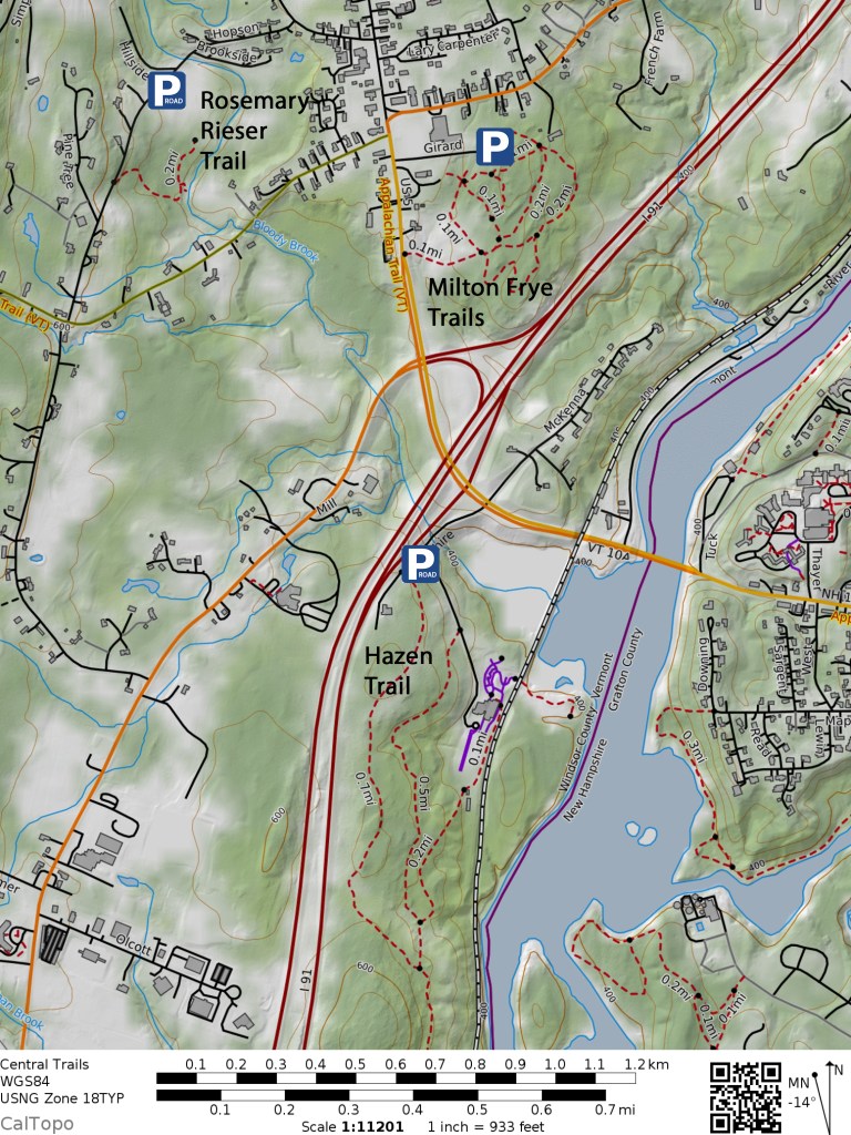 Milt Fry was principal for 23 years at Norwich’s Marion Cross School, which is adjacent to this 35 acre conserved property, sometimes called the Norwich Nature Area. Several interlaced loop trails are on the property. Frequently used by students from the school. all trails are for foot traffic only. The main trailhead is at the S. end of the Marion Cross School teacher’s parking lot, usable when school is not in session. Otherwise parking is available along Main Street and elsewhere in the village area. Please note: The referenced map, while topographically detailed, needs updating with respect to several trail locations.