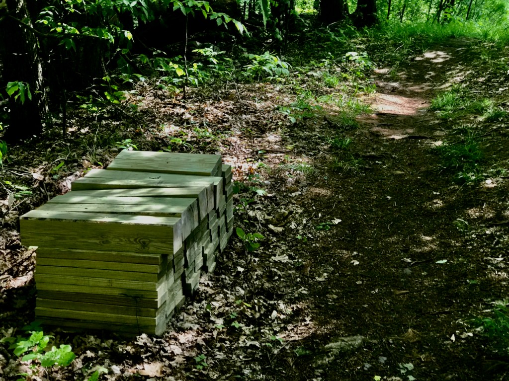 On June 6th, eight volunteers for Norwich Trails assembled at the Elm Street trailhead of the Heyl Trial at 0830 to build a 50-foot-long bog bridge in a perennially wet section of the trail. The area addressed had seen a number of unsuccessful measures taken, previously, including planks and a drainage culvert. The participants were (in alphabetical order):