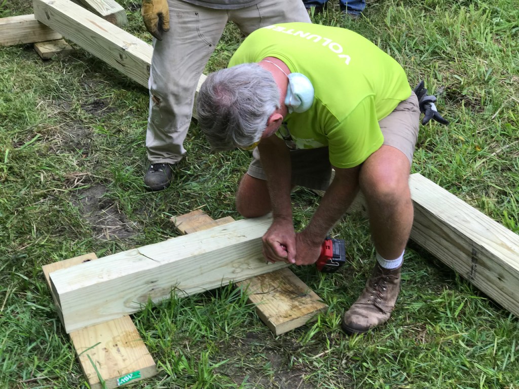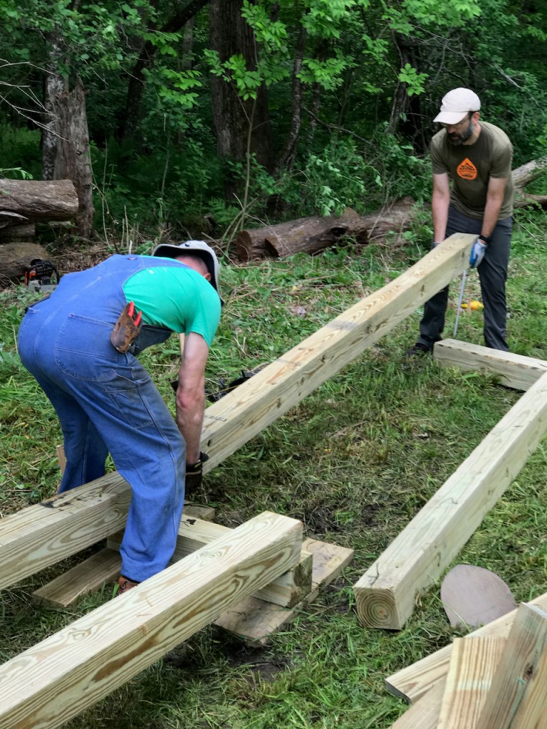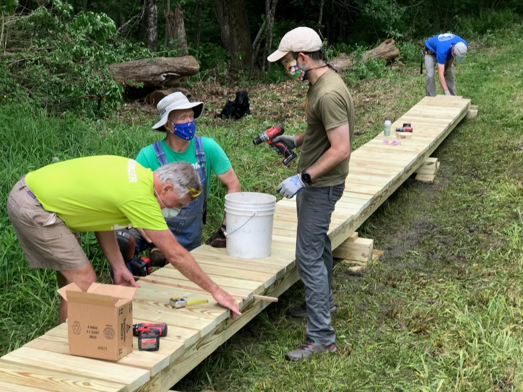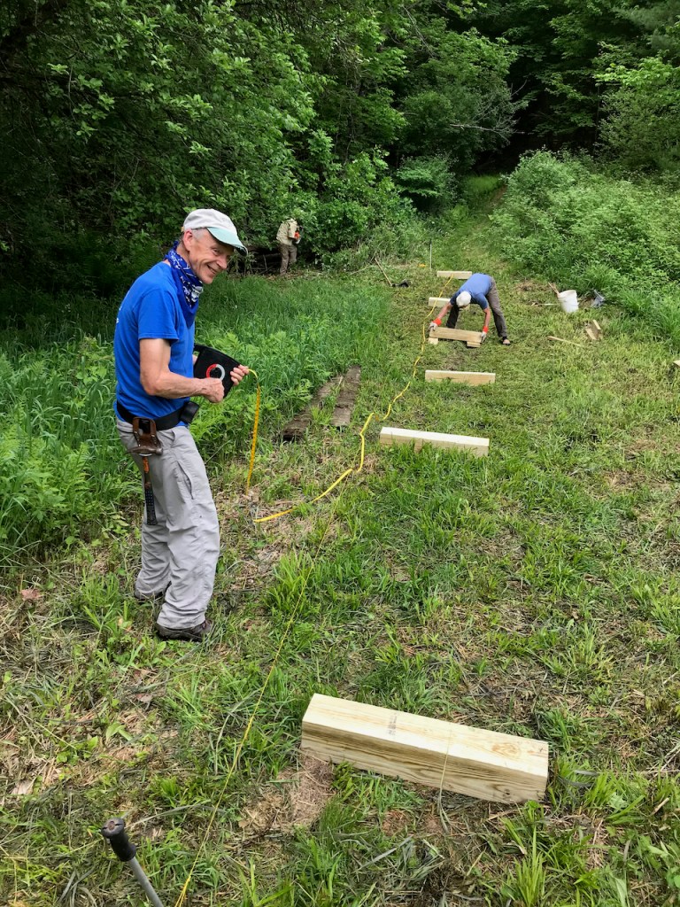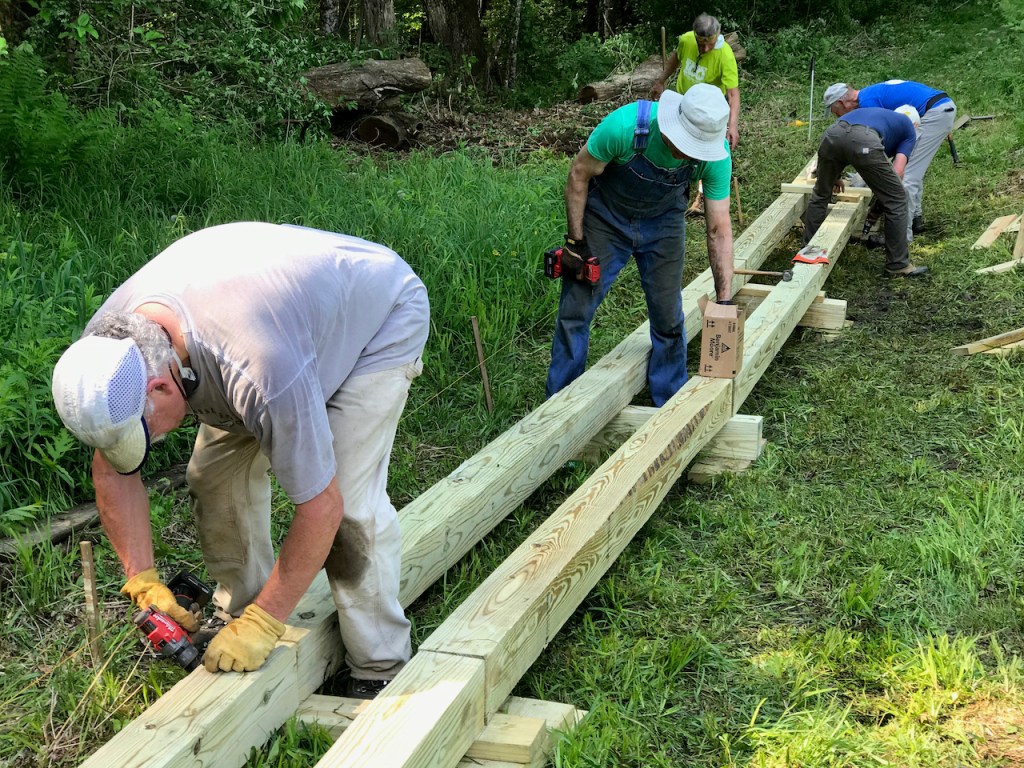 While Bob Fisken cleared away fallen trees in the way of the site’s drainage, the rest of the crew carried in, laid out, and assembled the bog bridge.