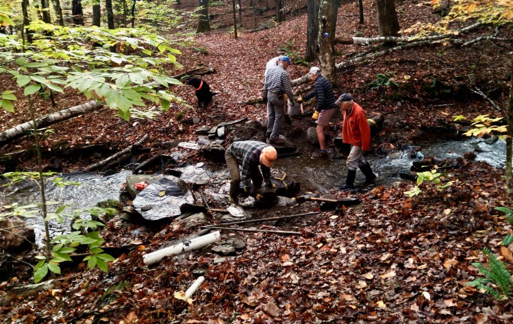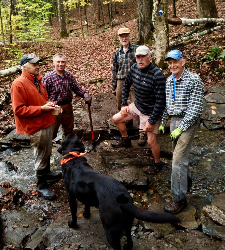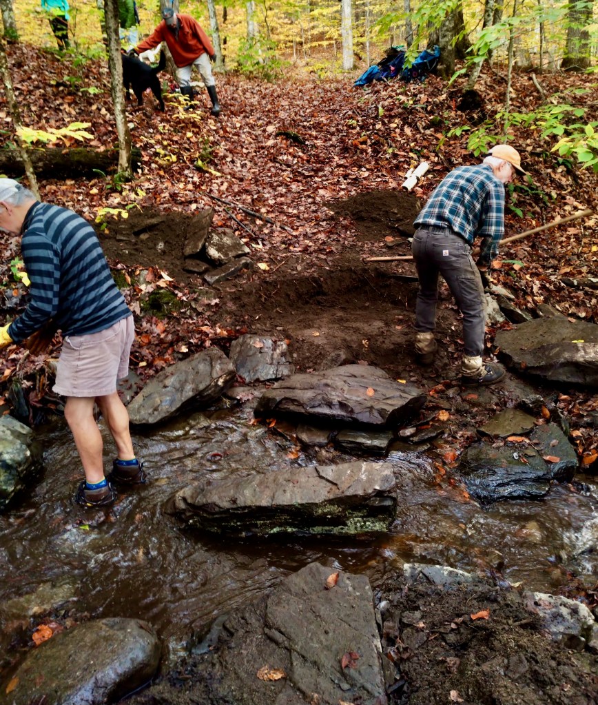 On October 17th, 2021 six stalwart Norwich Trails volunteers set out at 8:30 to improve the safety of crossing the brook at the bottom of Norwich’s “Grand Canyon” on the upper Ballard Trail during conditions of high water. The area of this crossing received its mock-grandiose, tongue-in-cheek name from Bill Ballard, himself.