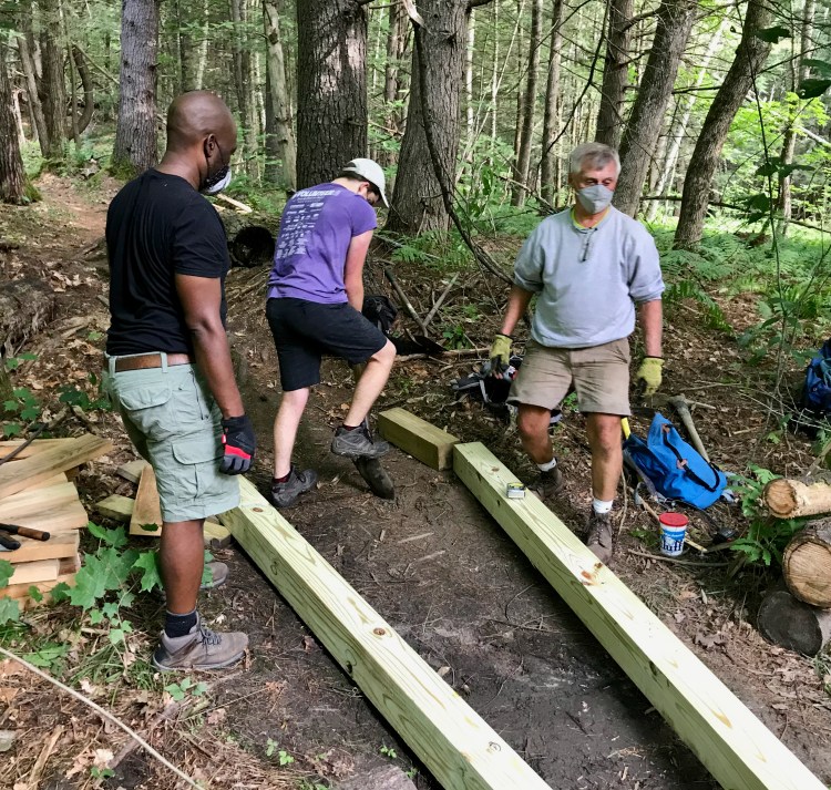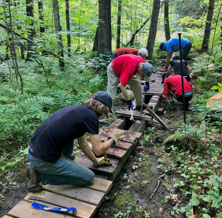 On August 23rd Norwich Trails volunteers gathered at the Parcel 5 trailhead parking lot at 0800, to extend at the top and rebuild at the bottom a 55-foot long bog bridge in a perennially wet section of the upper Ballard Trail. An earlier crew had completed substantial work on this structure when they elevated it from the mud and replaced sections of it on July 12. Participating were: