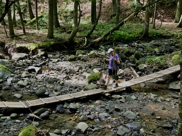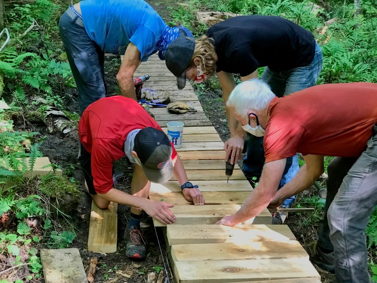 While one crew tore the rotting decking off the lower end of the bridge, another crew added stringers and footers to the top end of the bridge. The bridge received about 24 feet of new decking in its 12-foot extension. A third crew went up the trail to perform reconnaissance and lopping any branches that were poised to impinge on the trail.