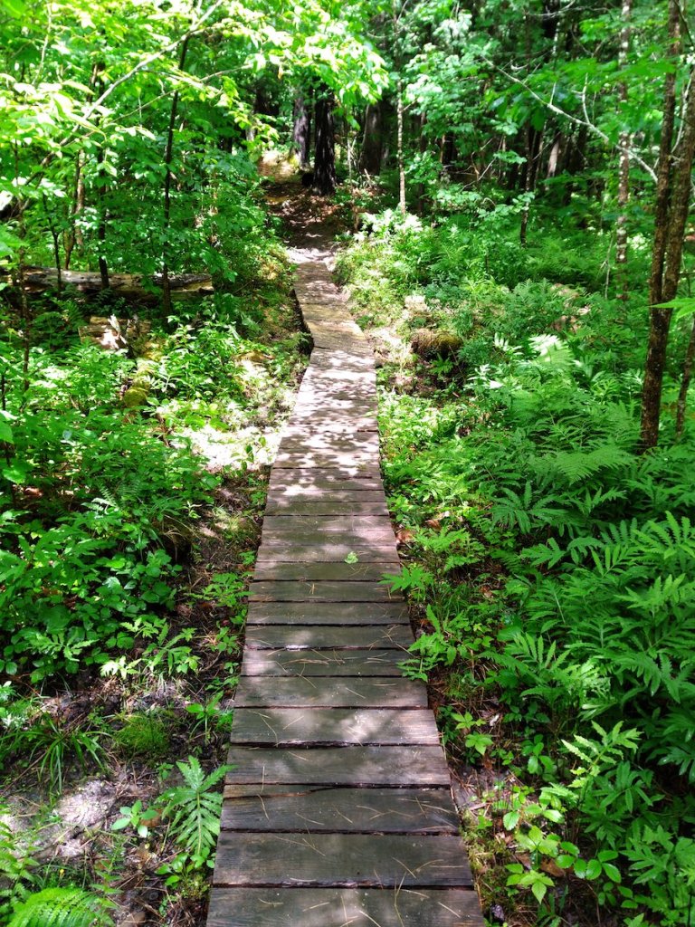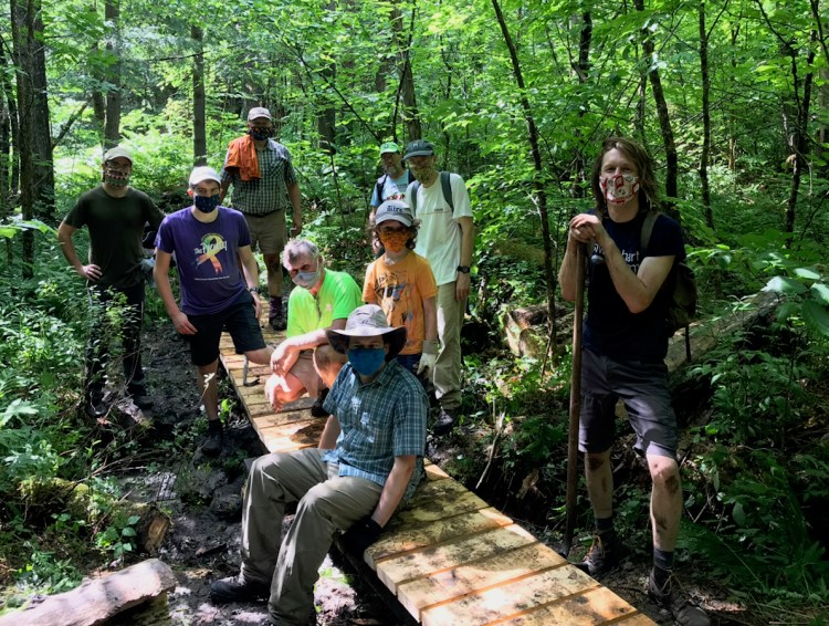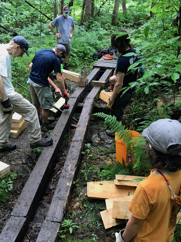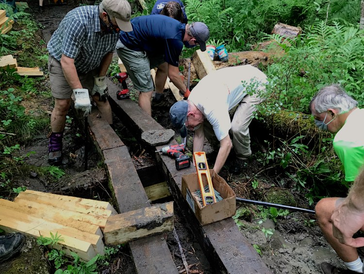 On July 12th, volunteers for Norwich Trails gathered at the Parcel 5 trailhead parking lot at 0800, to rebuild approximately one-half of a 55-foot long bog bridge in a perennially wet section of the upper Ballard Trail. On this rainy morning, we were all happy to see so many volunteers ready to carry materials to the work site, 3/4 mile up the trail: