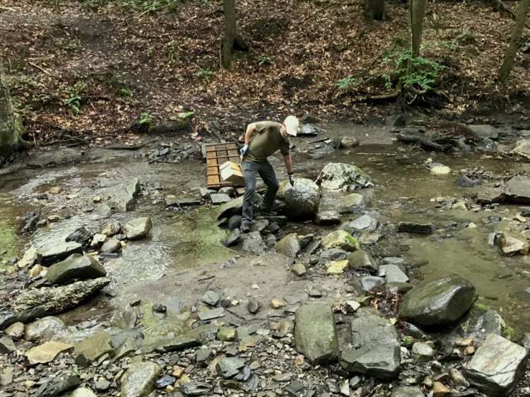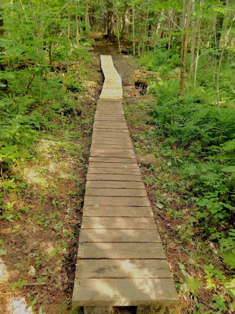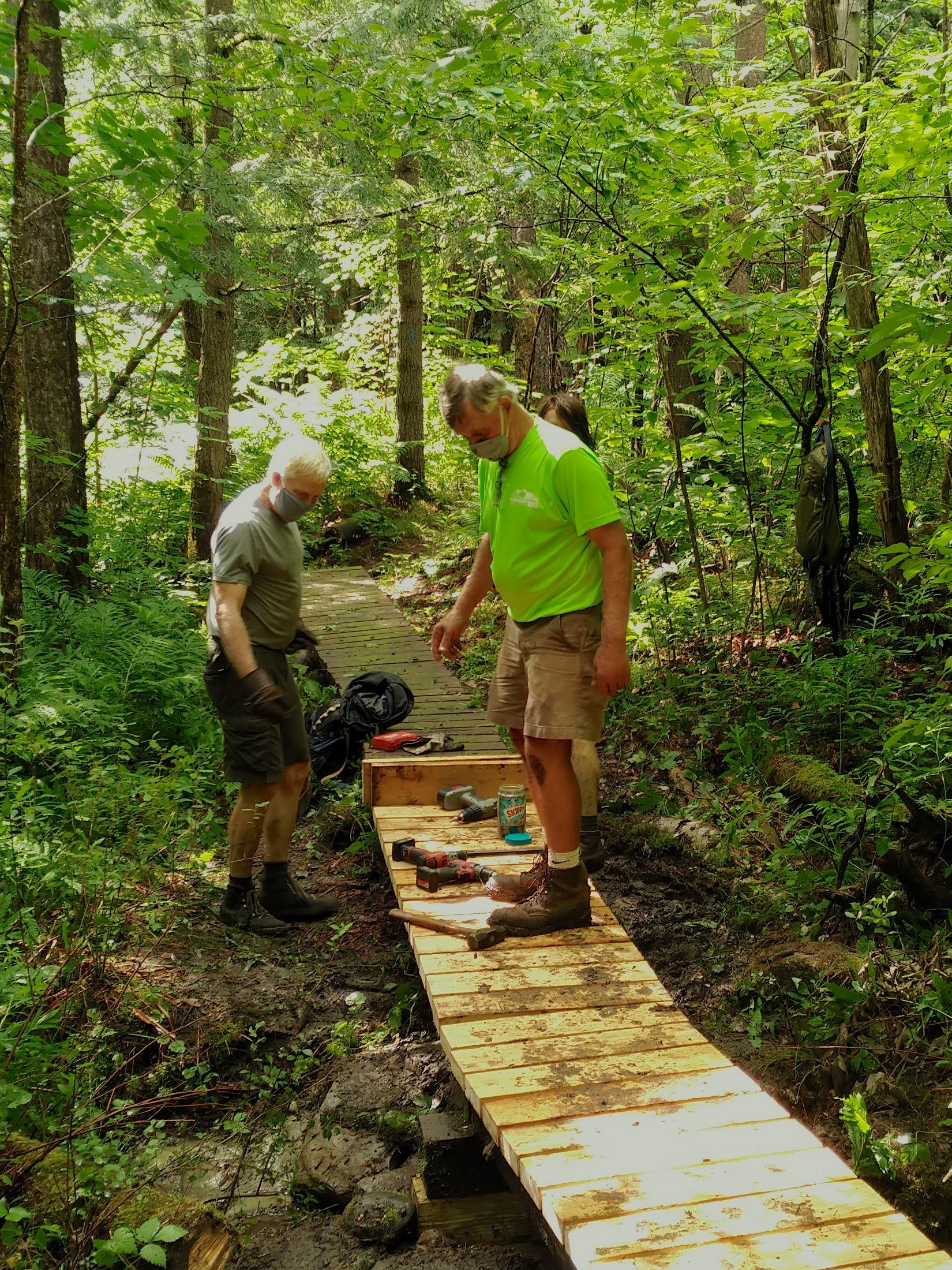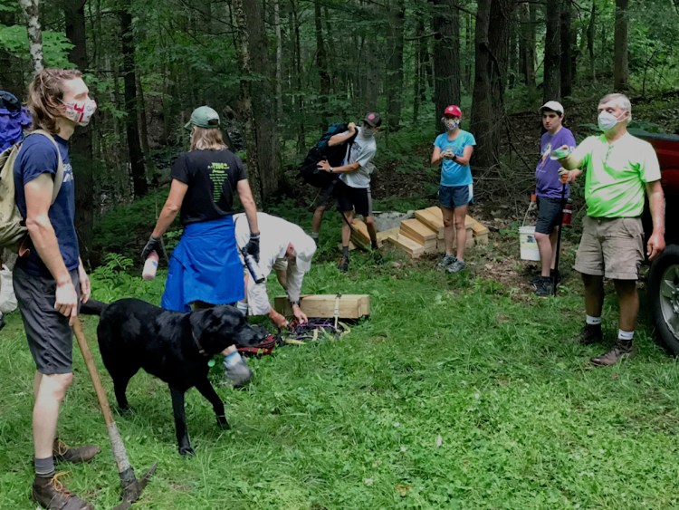 Jim Faughnan had pre-cut and pre-drilled about 80 pieces of lumber, which were stacked at the edge of Charles Brown Brook (site of the destroyed bridge, replacement not yet available). So our initial challenge was to move the wet wood plus all tools and hardware across the brook and up the trail to the work site!