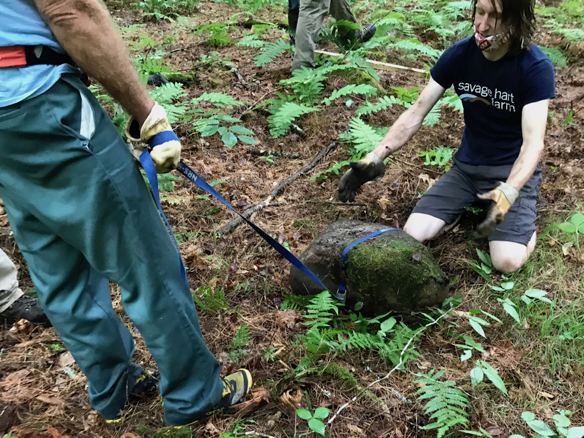 As each section of the structure was stabilized at its new elevation, other crew members could begin to distribute and fasten the decking boards. Other crew members succeeded in moving a 250 pound boulder uphill, providing a safe transition from the newly raised upper end of the bridge.